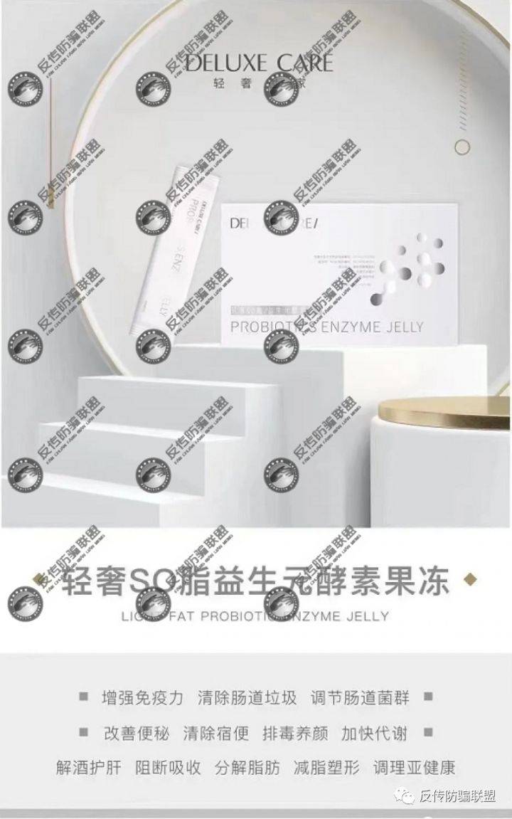 据代理商提供的产品宣传图显示,轻奢世家益生元酵素果冻有增强免疫力、改善便秘、排毒养颜、解酒护肝、减脂塑形、调理亚健康等多种功效。