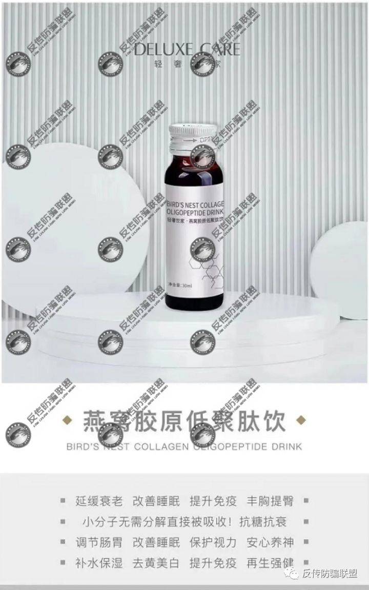 而另一款名为“轻奢世家燕窝胶原低聚肽饮”的产品则宣称不仅能延缓衰老、改善睡眠、丰胸提臀、抗糖抗衰,还能调节肠胃、保护视力、去黄美白、提升免疫、再生强健等多种功效。