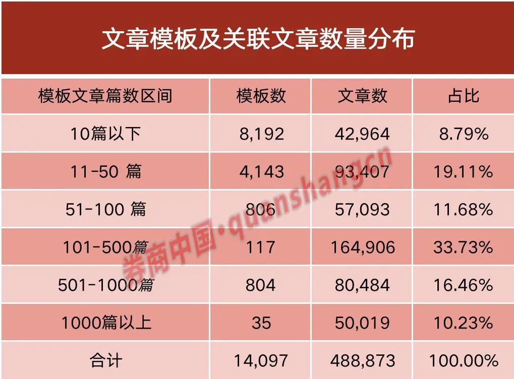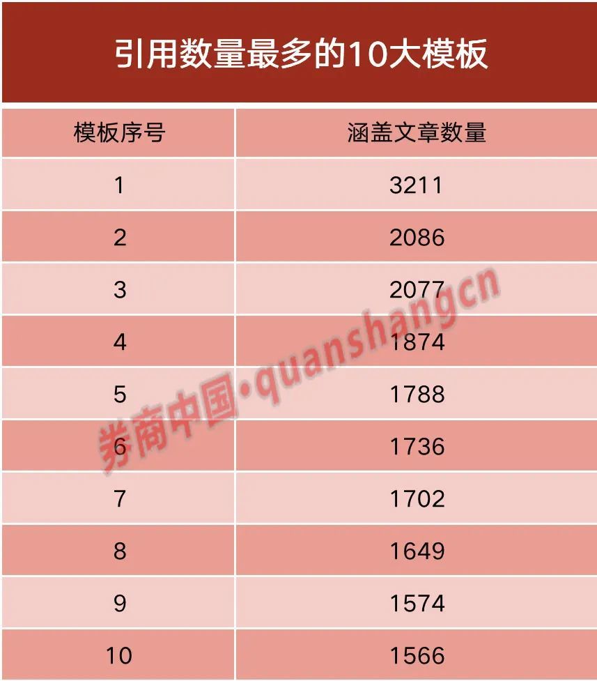 数据还显示,有约50000篇“代理维权”文本套用了35个模板,其中有10个模板涵盖的文章数量均超过1500篇,使用率最高的一个模板甚至出现在3211篇文本中。