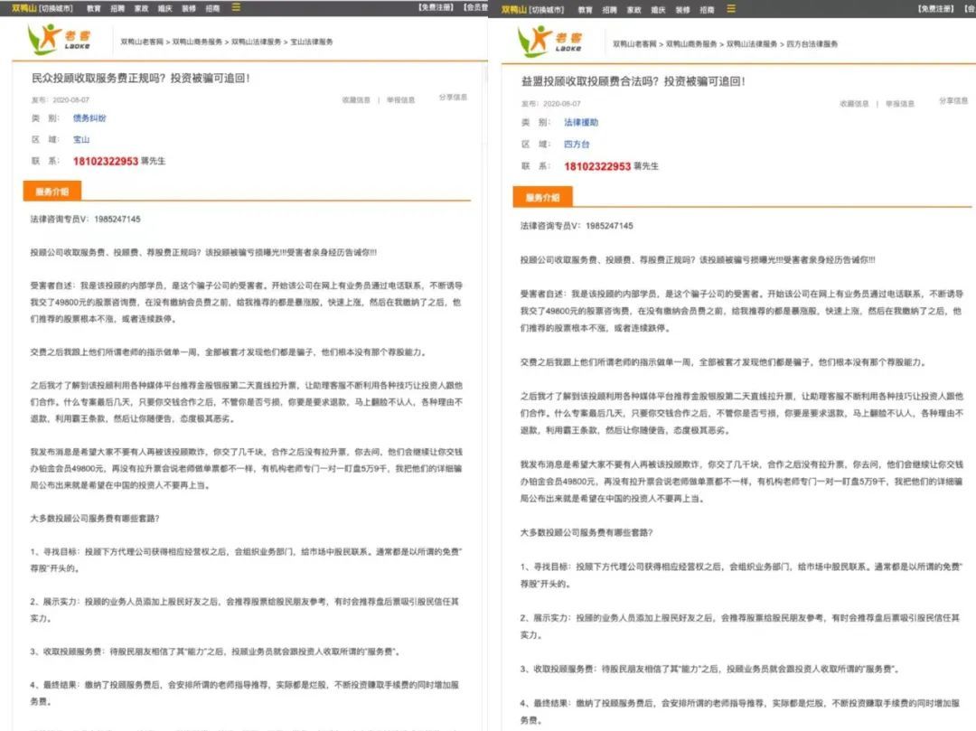 比如看以下的两个文本,一位文章发布者自称“民众投顾收取服务费正规吗?投资被骗可追回!是该投顾的内部学员,是这个骗子公司的受害者”,并留下了联系方式。而在另一篇文章中,几乎是一模一样的内容,标题被替换成了“益盟投顾收取服务费正规吗?”。