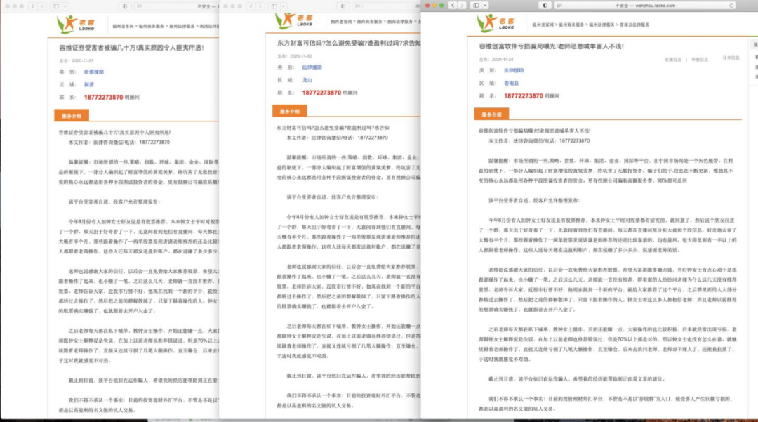 以老客网为例,多篇“维权”文章均留下了同样的手机号。