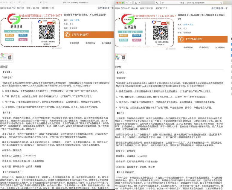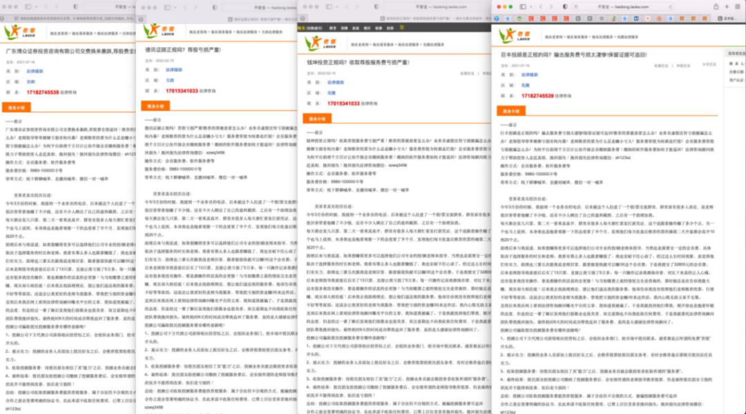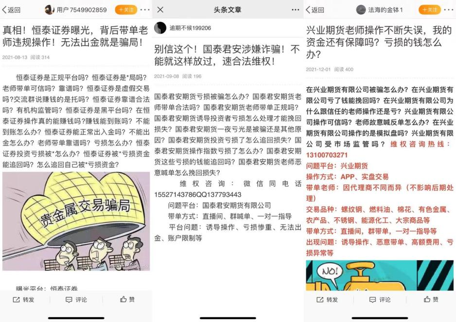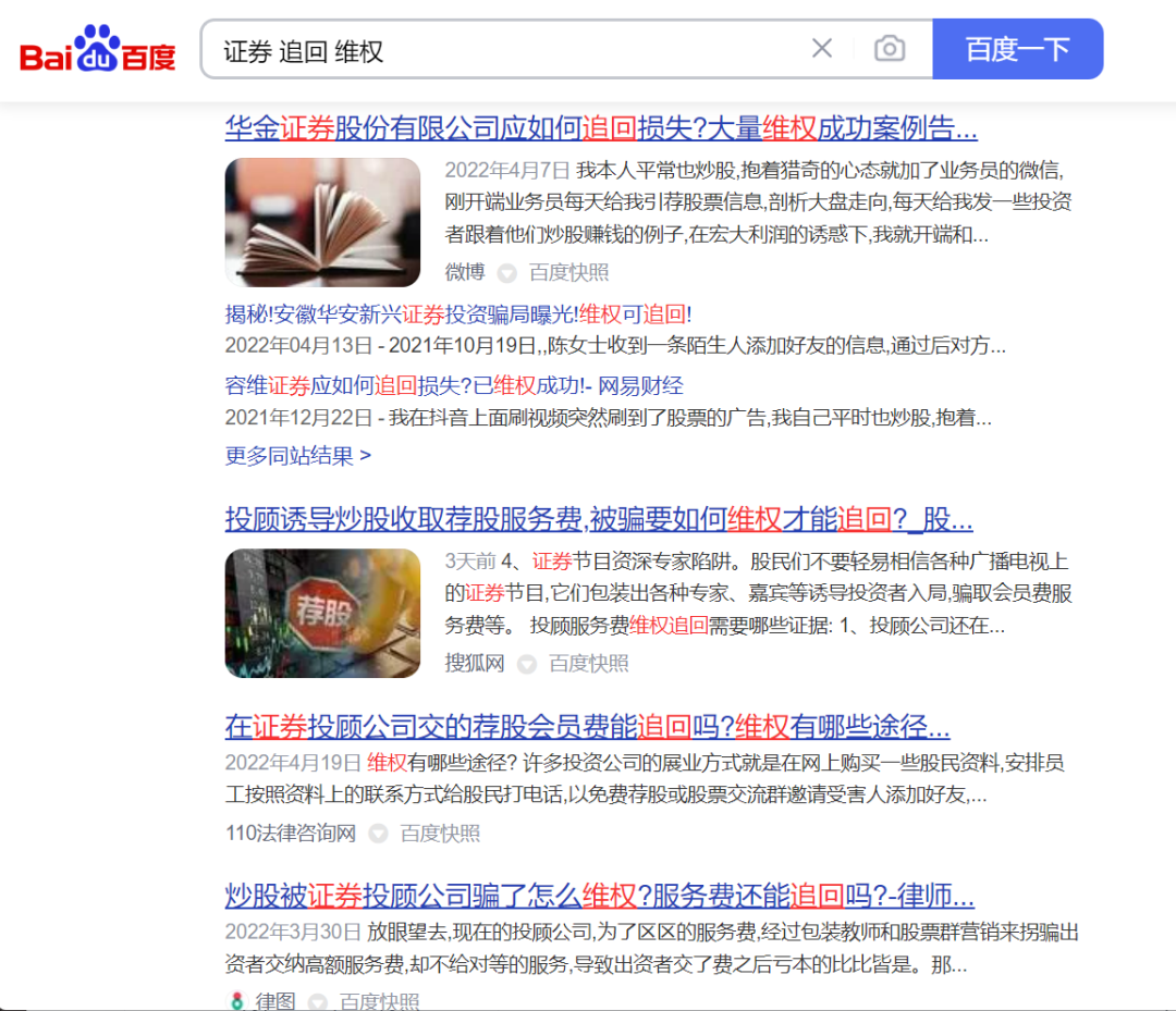 甚至于,在各类搜索引擎上搜索证券、期货、投资咨询公司名字,都能看到诸多维权信息,这些信息大同小异、真伪难辨。网络上出现了不少维权个体或机构,号称自己是专业的律师团队,能够迅速帮助投资者讨回在非法交易平台的经济损失。