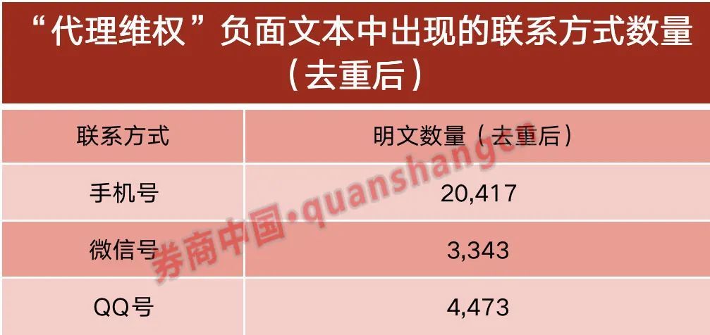 进一步分析这些所谓的“网络维权”文本,可以看到74%的文章都带有手机号、微信号、QQ号等联系方式,并且这些联系方式存在高度一致的情况。