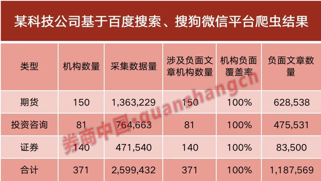 结果显示,在抓取到260万条信息数据中,基于BiLSTM- DPTextCNN深度网络模型以及金融领域情感词典构建的深度联合学习模型,最终筛选出近119万篇符合特征的维权文章。其中,证监会旗下140家证券公司、81家证券投资咨询机构和150家期货公司全部命中,成为“维权”对象,命中率达100%,371家机构无一幸免。