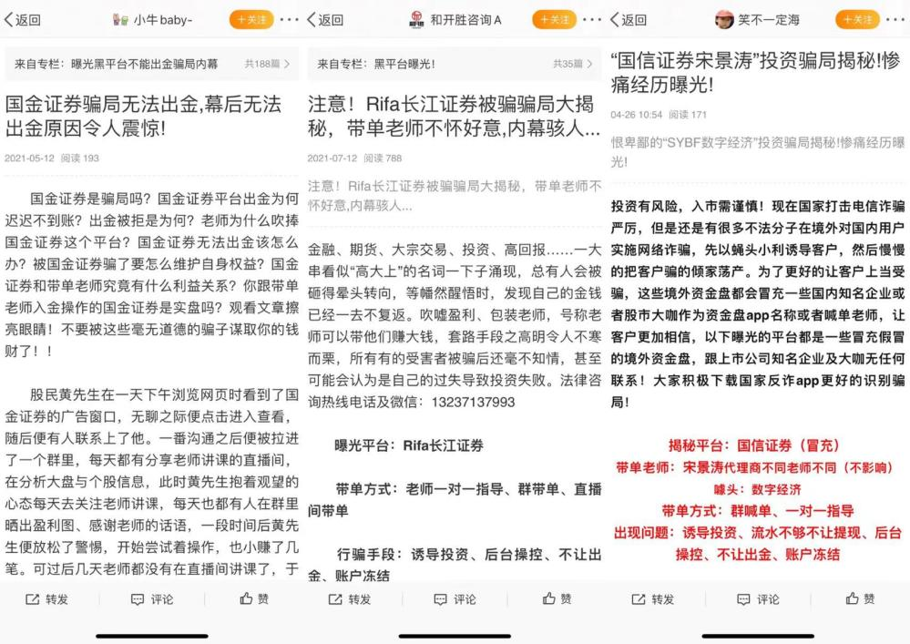 对于金融机构来说,代理维权团队编造的一些子虚乌有的所谓旗下员工“恶意喊单”“恶意带单”等不实信息,也让金融机构的声誉与形象遭受严重的抹黑。其中,证券投资咨询机构遭遇“碰瓷”的频率最高,此前,包括河南和信证券投资顾问股份有限公司、青岛大摩证券投资有限公司、江苏天鼎证券投资咨询在内的多家公司发布相关诋毁信息的声明。