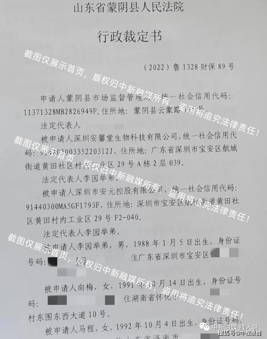 中新融媒接到知情人透露,蒙阴县市场监督管理局在查处深圳安馨堂生物科技有限公司涉嫌传销以及关联方深圳市安元控股有限公司、李园举弟、向梅、马程、柴蓉、万秀丽、魏安琪、肖承荣、朱川、江琳玲,为防止被以上公司及人员转移或者隐匿违法资金,于2022年5月10日向蒙阴县人民法院提出申请,要求冻结以上公司及人员在金融机构的银行账户存款,共计冻结额度1.75亿元。