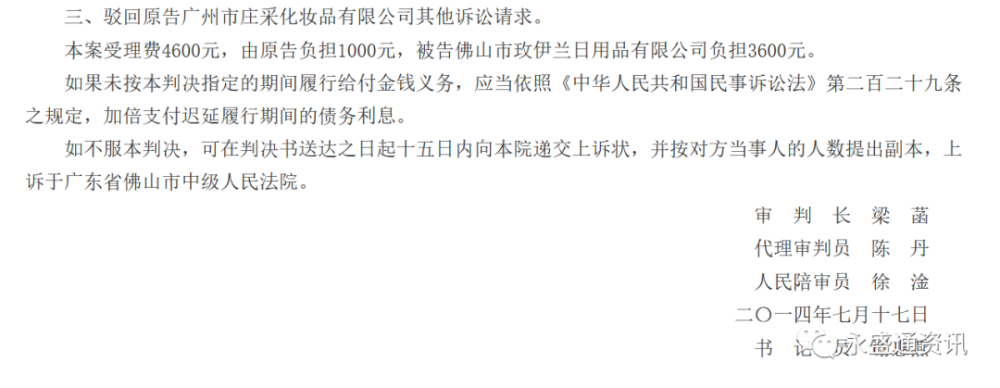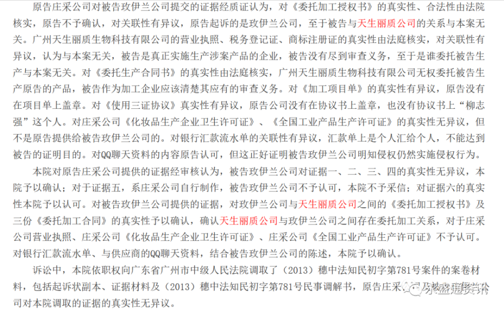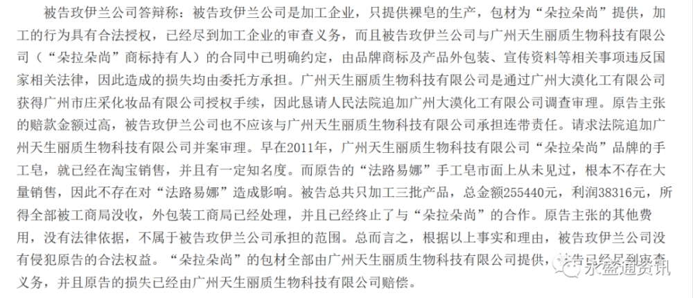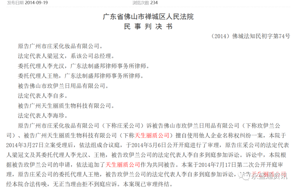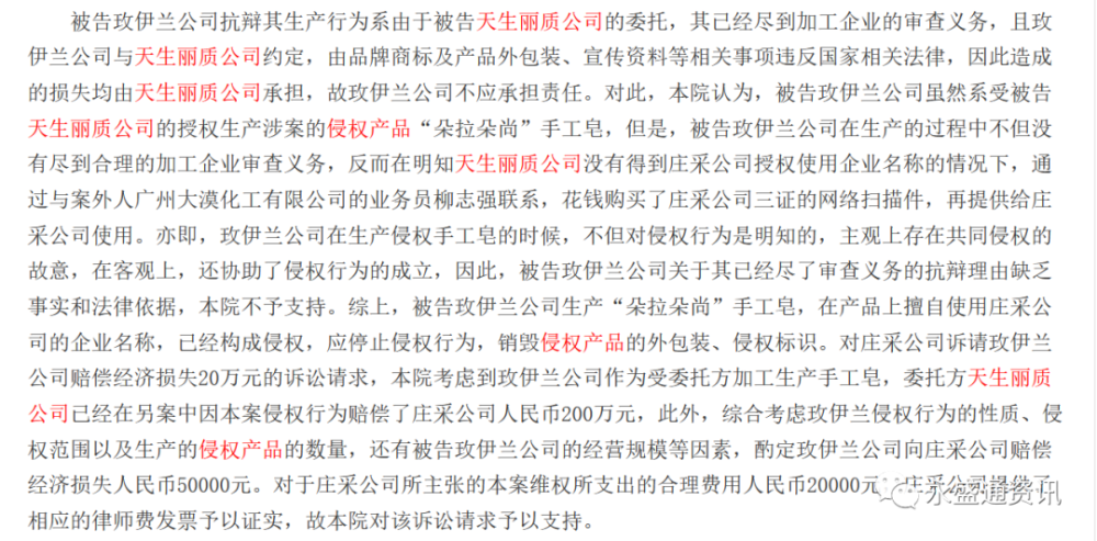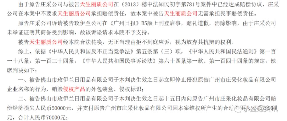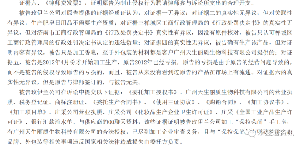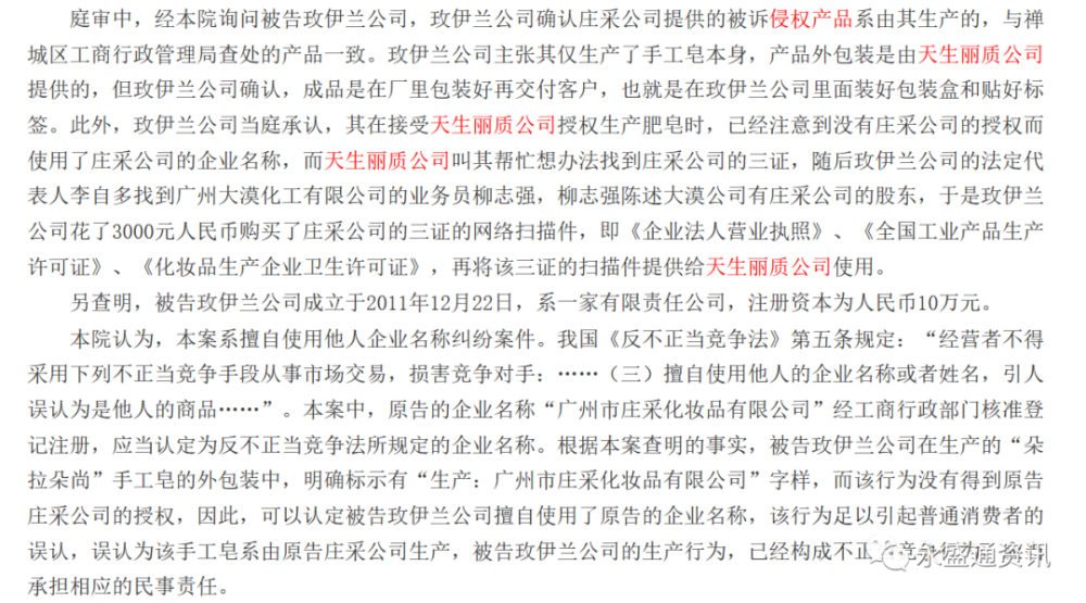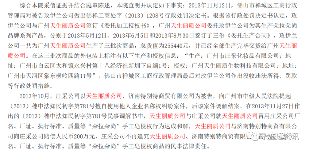 2014年法律文书网,一封民事调解书也佐证了该事实。该民事调解书提及,天生丽质公司与庄采公司就天生丽质公司冒用庄采公司厂名、厂址、执行标准、质量等“朵拉朵尚”手工皂侵权行为达成和解,天生丽质公司与济南特别特商贸有限公司向庄采公司赔偿人民币 200 万元,庄采公司不再追究天生丽质公司、济南特别特商贸有限公司冒用庄采公司厂名、厂址、执行标准、质量等“朵拉朵尚”手工皂侵权商品的民事法律责任。