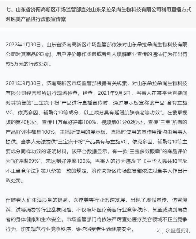 据市场监管总局信息披露,2022年以来,各级市场监管部门聚焦民生领域群众反映强烈、社会舆论关注的突出问题,重拳出击,严厉打击医疗美容领域虚假宣传等违法行为,其中第七个经典案例是:山东省济南高新区市场监管部查处山东朵拉朵尚生物科技有限公司(以下简称“朵拉朵尚”)利用直播方式对医美产品进行虚假宣传案。