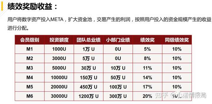 以M3级别为例,个人投资5000U,团队裂变业绩30万U,直推业绩10万U,满足这些要求即可拿到11%的动态提成奖励。如果出现同级可以拿到10%的同级绩效奖。
