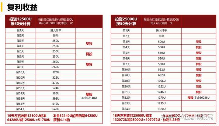 今天说的这个是币圈盘子,所以全程使用的都是USDT,日返利为投资额的1%-3%。基本可以定为日返利2%,以投资1000USDT为例,50天就可以赚回本金。按照模式,收益获得两倍后出局。