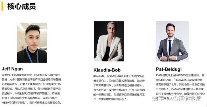 该项目名称为“META数字资产投资基金”,宣传以数字资产对冲量化交易的方式帮助客户交易。并在PPT中展示近几年在国外推广中持续稳定的帮助客户盈利,在2022年登录中国市场。背书罗列了一大堆,小诺仔细看过之后觉得背书的主体与币圈公链资金盘项目没什么区别,找几个国外模特的照片附上文案就是交易或者研发团队了。然后再以当下的金融国际国内形式做铺垫,凸显项目本身的可行性。而实质上国内连个注册公司都没有,简直就是开局一张图,内容全靠编!