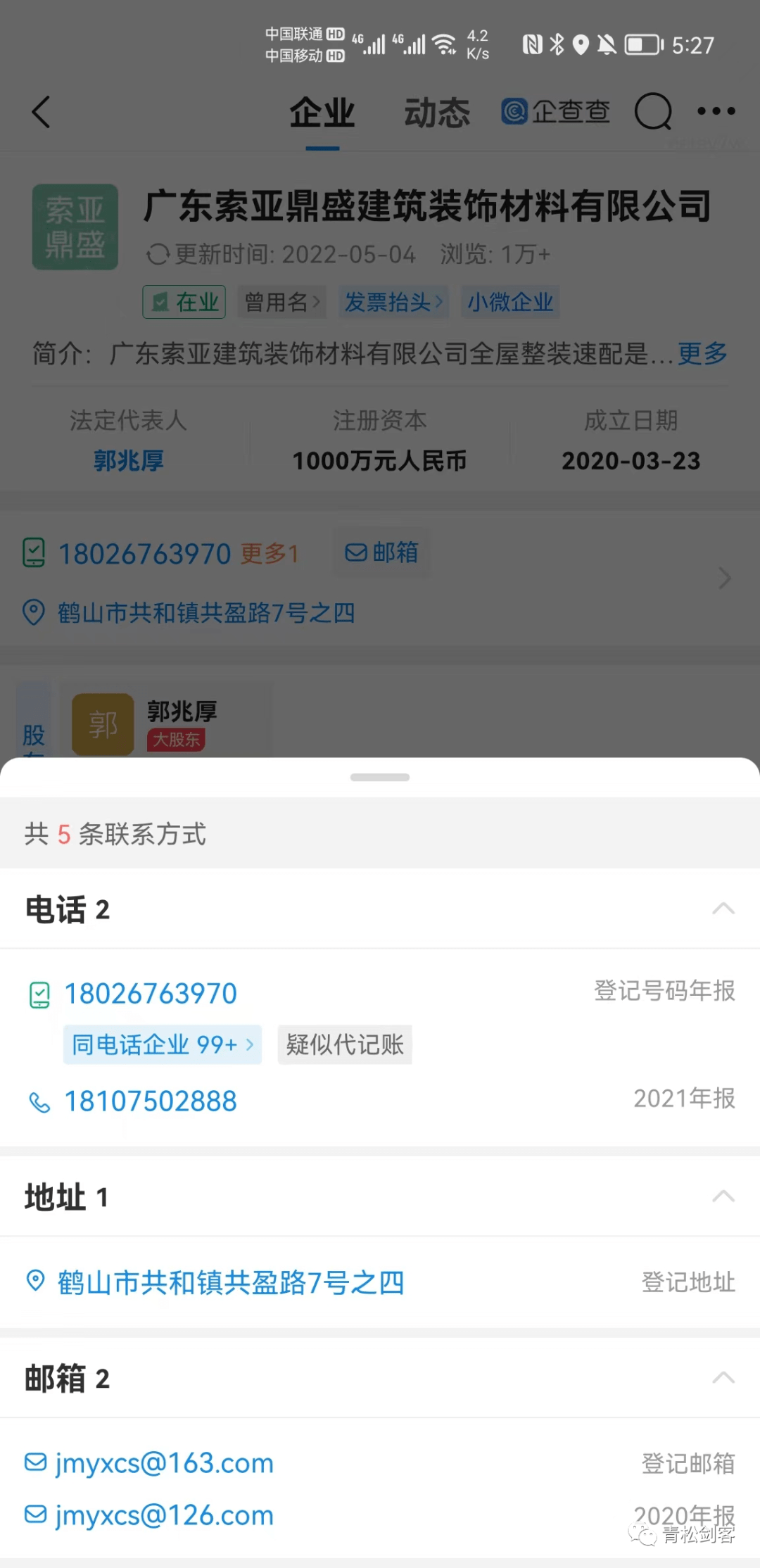企查查软件显示其疑似为代帐公司