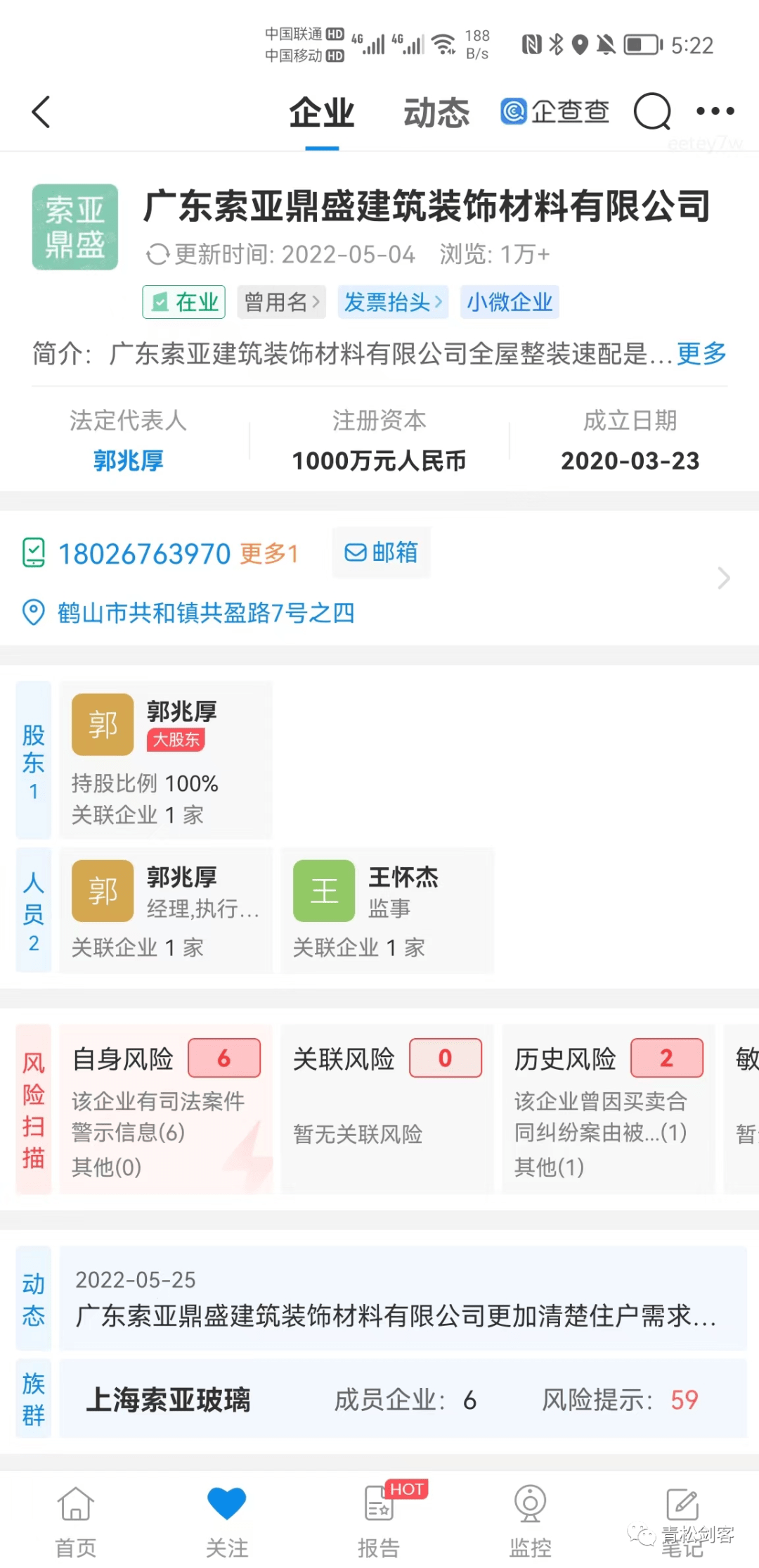 经查广东索亚鼎盛建筑装饰材料有限公司注册信息显示法人为郭兆厚