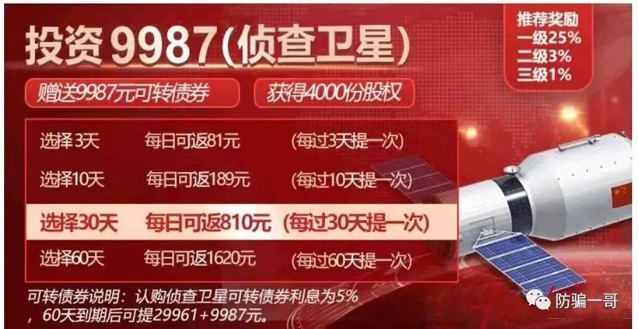 下方还有气象卫星、广播卫星、地球资源卫星、侦查卫星等投资项目,其中年化利率最高的是价值9987元的侦查卫星,选择3天每日可返81元,粗略计算下来,其年化收益率高达98%。