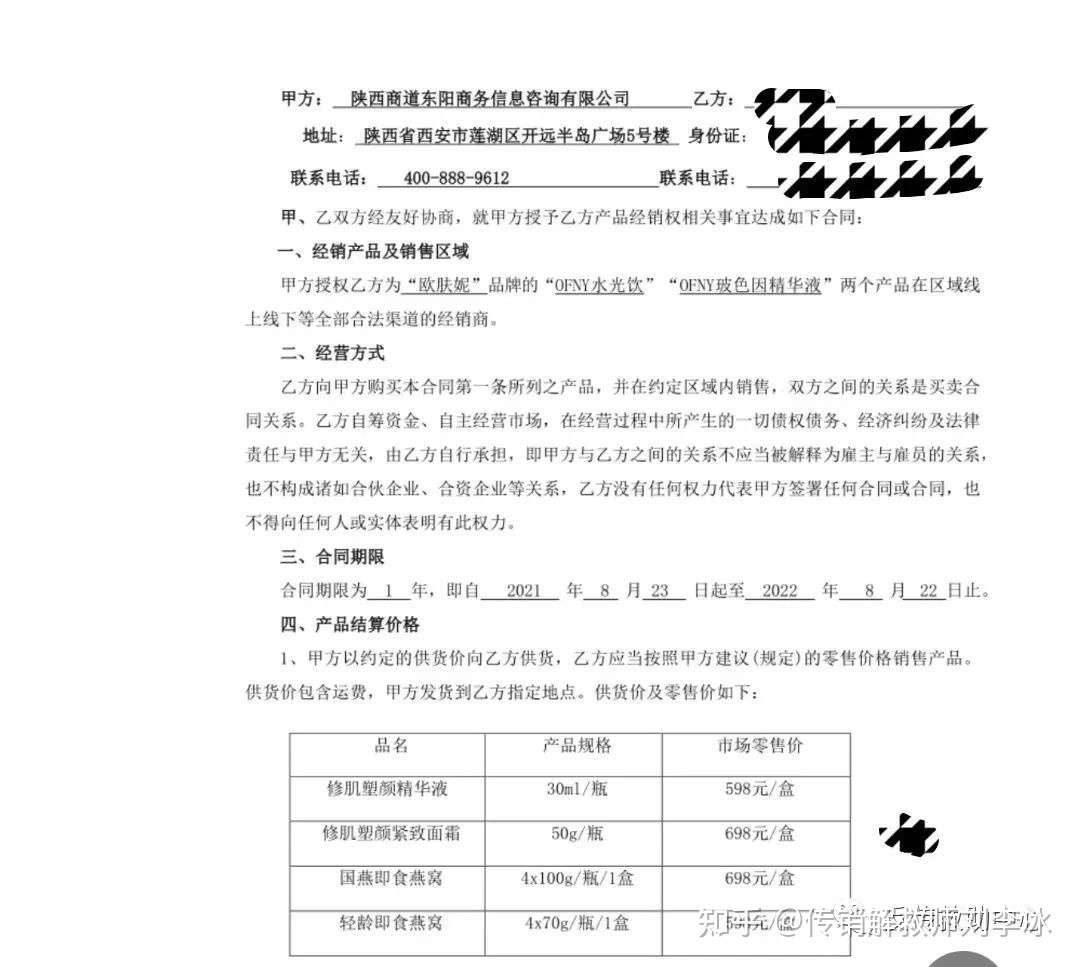受害者讲述签署的合同的主体是陕西商道东阳商务信息咨询有限公司,委托的品牌为欧肤妮,而实际收到的货品却是另外一家企业“陕西美燕堂生物科技有限公司”的产品,
