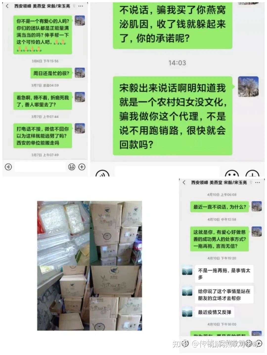 收到货后没人联系,自己也卖不了,联系宋想退货,可他说找导师帮我,导师这也是要自己找人头,她们帮着洗脑买过劝说做代理。11月80多岁老妈身体不好看病要钱,而我也到了交医保和养老保险费的时候,我又找到宋让帮我出货,他推三推四就是没有行动,过完年母亲病重急需照顾,用钱住院治疗,找宋苦苦哀求,让帮着出货,退货或半价处理都可以,人嘴上说答应着就是没有行动,直到老妈去世,宋也没有出一分钱货,搞得我也没有回家连老妈最后一面也没有见到。