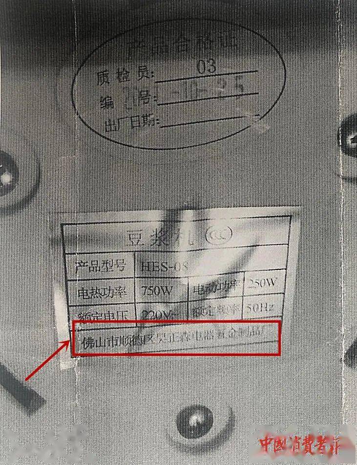 豆浆机底盘标注的生产厂家,宁波市消保委供图。