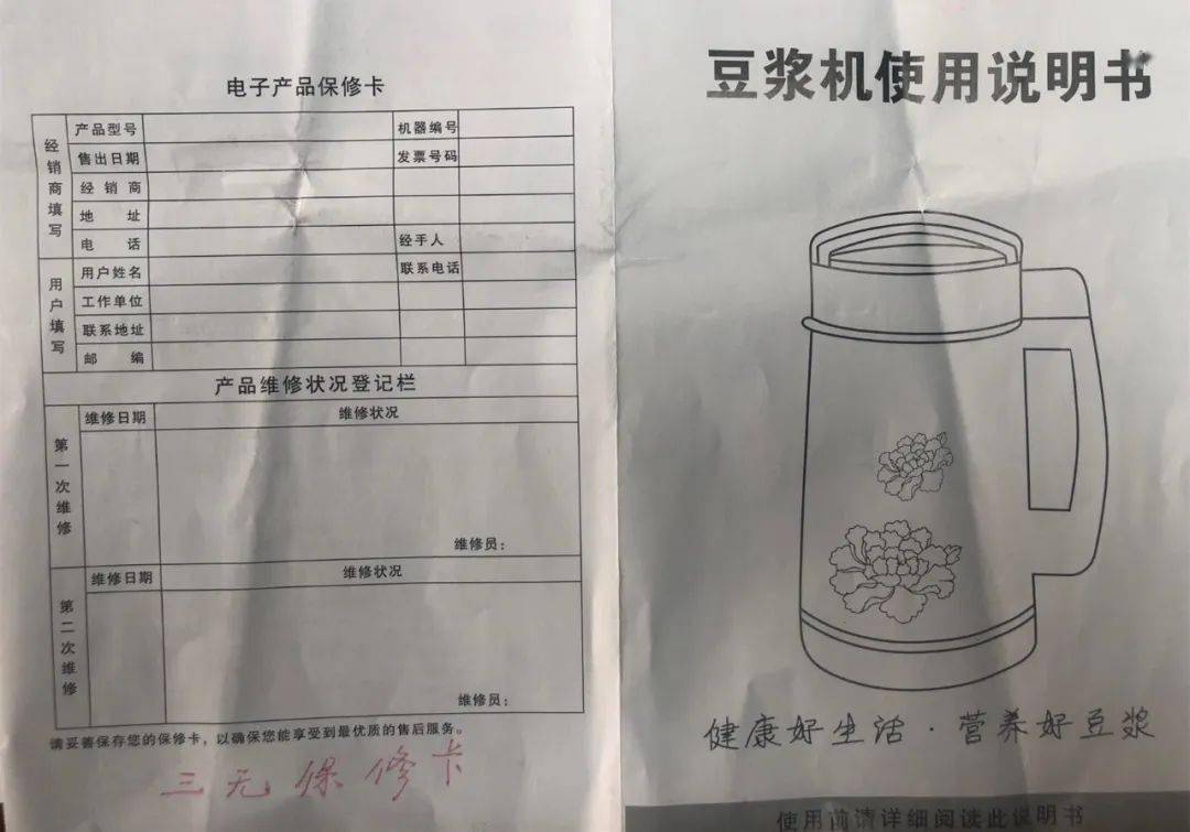 “JIUCIYANG”豆浆机产品使用说明书,宁波市消保委供图。