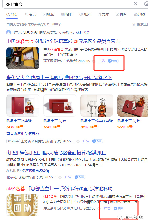 现在 ,在百度搜索 “ck轻奢会”排名最靠前的都是花钱做的广告推广,也就是再想收割最后一波。