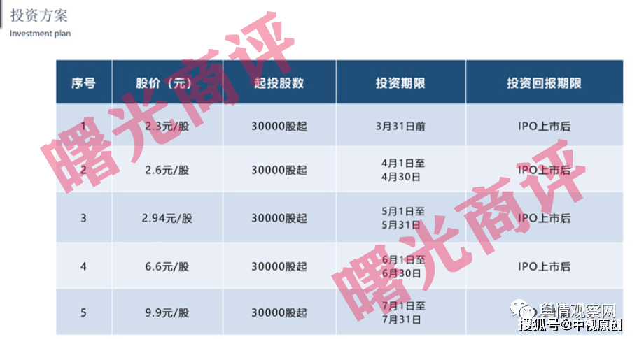 据其官宣资料显示,天秀集团主要经营范围包括农林种植、荒山绿化、生态农业园林开发、殡仪礼仪服务等业力,而为了更快的兜售其原始股份,让更多的人员参与进来,曙光商评发现运城市天秀生态农业开发集团有限公司还推出了不同的投资节点,越是早参与越赚钱,例如,3月31日前,按2.3元/股,30000股起投,4月按就是2.6元/股,5月2.94元/股,6月6.6元/股,7月9.9元/股,投资的金额越多,获取的回报也就越高。