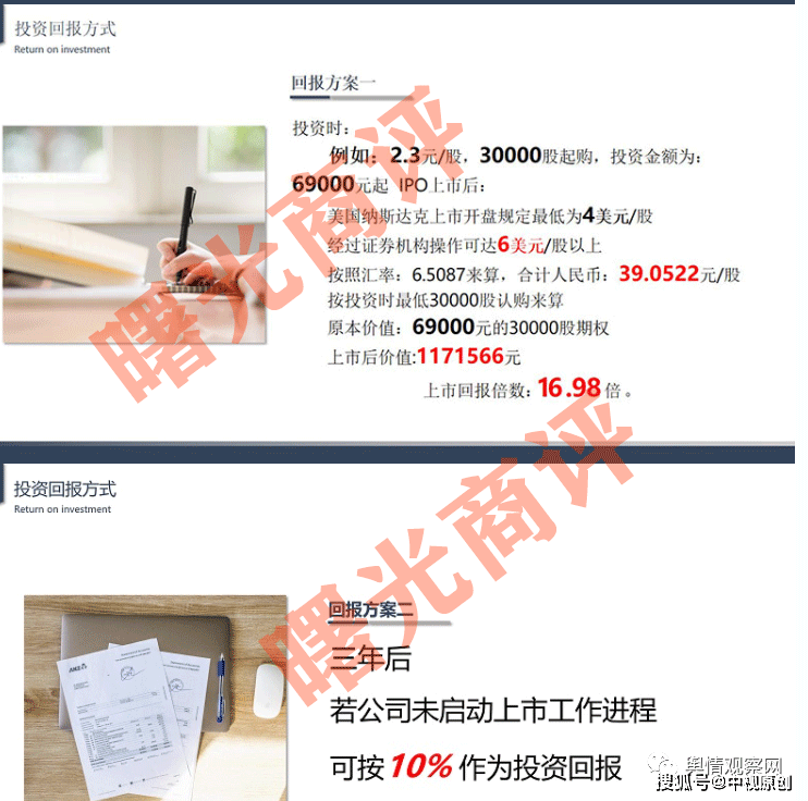 据悉,天秀集团自2021年就在启动上市会议,而知情人对曙光商评说:“这简直就是大扯虎皮”,以赴纳斯达克上市为由大肆兜售其原始股份,其计划出让32%的股份融资3.2亿元,宣传的上市回报高达17倍,投入6万元即可获取高达102万元的回报,若是未能上市,按年化10%作为回报,保本保息,简直稳赚不亏。