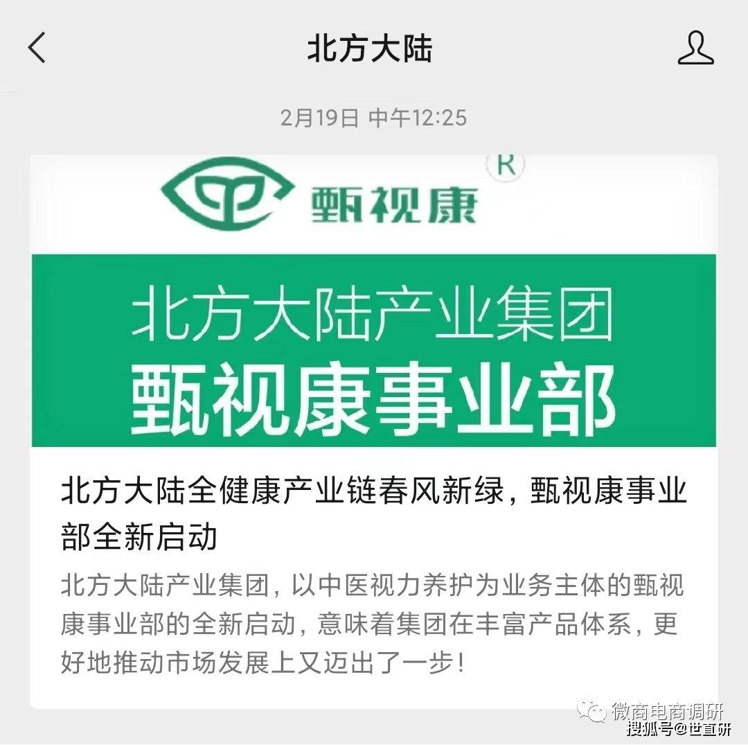 2月19日,北方大陆微信公众号发布文章《北方大陆全健康产业链春风新绿,甄视康事业部全新启动》。文中称,“在经过董事会认真研究分析后确定,决定自即日起,全面启动以中医视力养护为业务主体的甄视康事业部。”