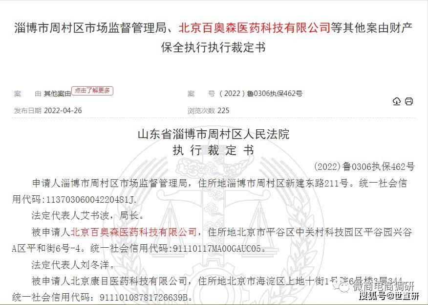 《执行裁定书》显示,淄博市周村区市场监督管理局在查处北京百奥森医药科技有限公司传销一案,本院于2022年4月19日作出(2022)鲁0306财保7号行政裁定书,裁定如下:冻结被申请人北京百奥森医药科技有限公司、北京康目医药科技有限公司、北京康目医药科技有限公司河南分公司、刘园园、孟跃辉、刘冬洋、程俊芳、刘洁在各银行账户内的存款15000000.00元;如无存款或存款不足,即查封或扣押其相应价值的财产。
