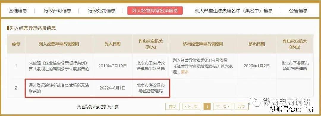 此外,微商电商调研近日从国家企业信用信息公示系统了解到,百奥森医药已经于今年6月1日被北京市海淀区市场监督管理局列入了经营异常名录,原因是“通过登记的住所或者经营场所无法联系”。