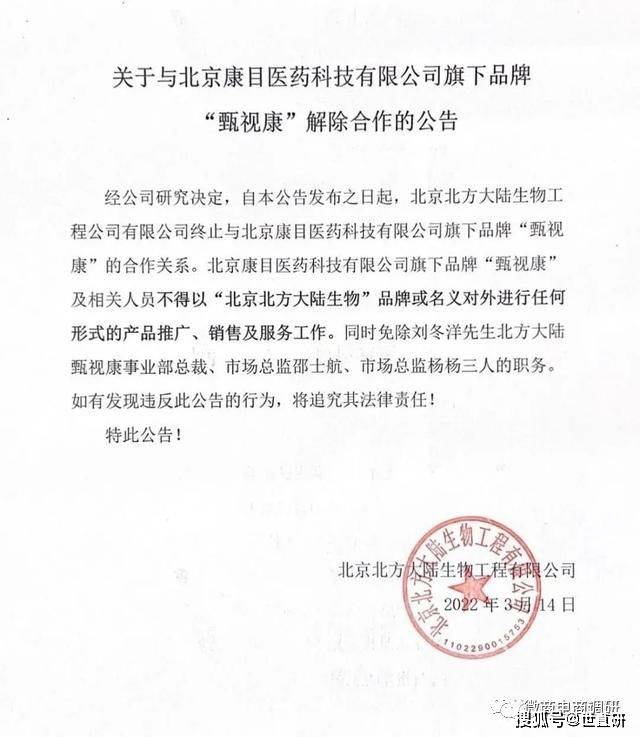 3月14日,北方大陆发布公告称,终止与北京康目医药科技有限公司旗下品牌“甄视康”的合作关系。北京康目医药科技有限公司旗下品牌“甄视康”及相关人员不得以“北京北方大陆生物”品牌或名义对外进行任何形式的产品推广、销售及服务工作。同时免除刘冬洋先生北方大陆甄视康事业部总裁、市场总监邵士航、市场总监杨杨三人的职务。