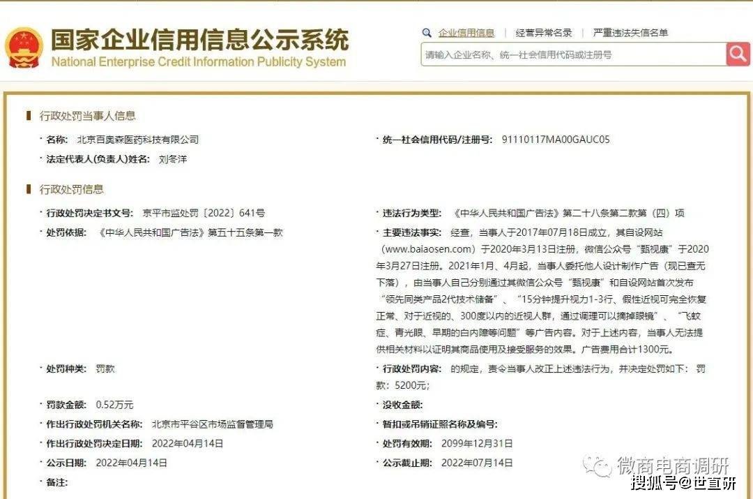 国家企业信用信息公示系统显示,百奥森医药自2021年1月、4月起,委托他人设计制作广告(现已查无下落),并分别通过其微信公众号“甄视康”和自设网站(www.baiaosen.com)首次发布“领先同类产品2代技术储备”“15分钟提升视力1-3行、假性近视可完全恢复正常、对于300度以内的近视人群,通过调理可以摘掉眼镜”“飞蚊症、青光眼、早期的白内障等问题”等广告内容。对于上述内容,百奥森医药公司无法提供相关材料以证明其商品使用及接受服务的效果。