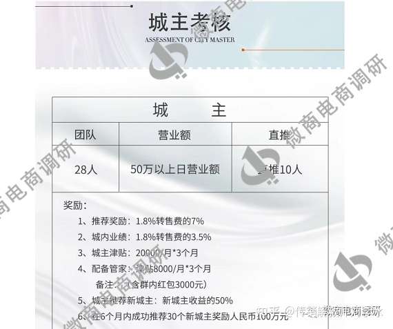由此可见,城联优品的参与者主要通过所谓的“转售”模式进行获利,上述奖金制度涉及到的动态奖励还包括直接分享奖励和城主奖励,值得一提的是,达到了城主条件并在6个月内成功推荐30个新城主就有额外100万元现金奖励可拿,这一条件的设置,让“拉人头”的意味体现得淋漓尽致。