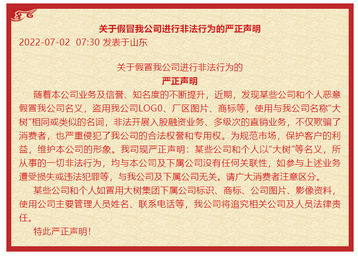 首先我们先来看下面“山东大树集团”公众号上面发布的《声明》:
