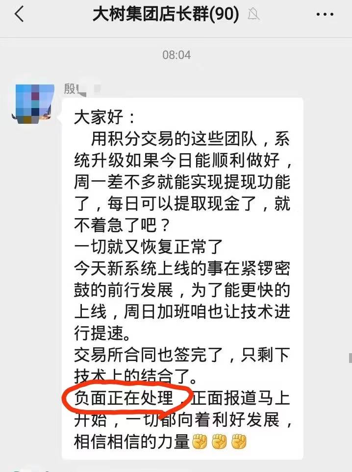 而且该传销平台有的负责人宣称,“这个公告是假的,你看那个章有缺口”,还有的负责人说,“这个公告不是针对我们平台,它提到我们平台了吗?”,还有的店长说,“这是给大树集团内部工作人员人看的,怕他们都不上班了,都来做……”,还有血本无归的一位会员原话是说“这是当XX,还要立XX”……到底怎么回事,笔者也搞不清楚,不知道大家心里清楚不?