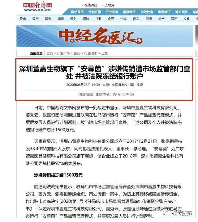 据中国经济网报道,日前,中国裁判文书网发布的一则裁定书显示,深圳市萱嘉生物科技有限公司、姜秀云、张嘉恒因涉嫌通过互联网在驻马店市运行“安幕茵”产品加盟代理模式,并层层发展人员进行计酬返利,被当地市场监管部门查处,上述公司及个人并被法院冻结银行账户总计1500万元。