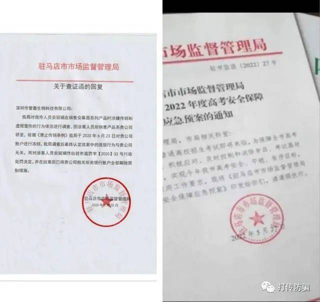 乍一看跟真的一样,没有辨别技巧还真看不出来。对此,打传防骗咨询多地市场监督管理局的办案人员核实情况,均表示该“红头文件”是伪造的。随后,经对比查实其他关于驻马店市市场监督管理局的公开文件来看,深圳市萱嘉生物科技有限公司发来的公章显示是伪造的。