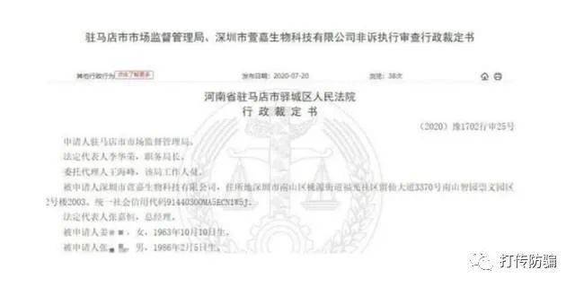前述司法裁定书显示,驻马店市市场监督管理局在查处深圳市萱嘉生物科技有限公司、姜秀云、张嘉恒涉嫌组织、策划传销一案中,为防止其转移或隐匿涉传资金,作出驻市监冻决字(2020)第1号《驻马店市市场监督管理局冻结传销资金账户决定书》,认定深圳市萱嘉生物科技有限公司、姜秀云、张嘉恒涉嫌通过互联网在驻马店市运行“安幕茵”产品加盟代理模式,并层层发展人员进行计酬返利。
