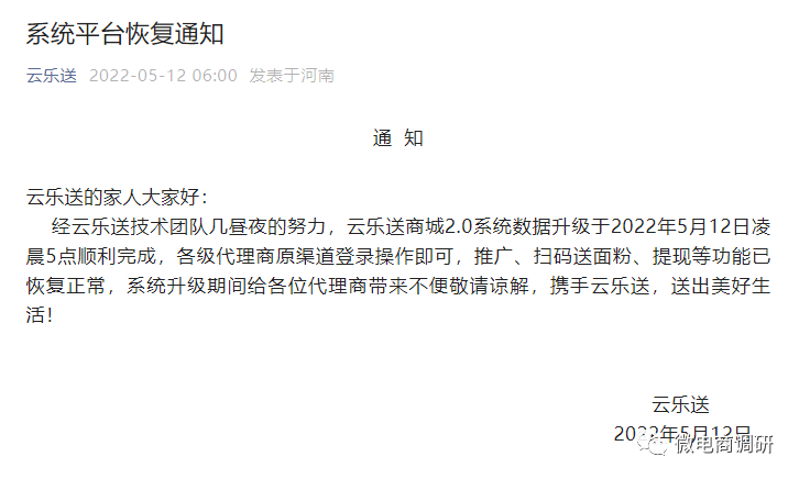 2022年5月12日,云乐送商城2.0系统数据正式完成升级。