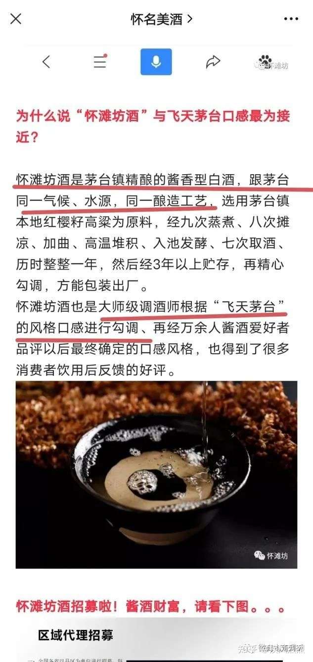 近日,微商电商调研注意到,市面上出现了一种名为“怀滩坊”品牌的酱香酒,喊着“喝酒不花钱,分享还挣钱”的口号在各大平台大肆宣传。分销商介绍道,怀滩坊酒是茅台镇精酿的酱香型白酒,跟茅台同一气候、水源,同一酿造工艺,选用茅台镇本地红樱籽高粱为原料,经九次蒸煮、八次摊凉、加曲、高温堆积、入池发酵、七次取酒、历时整整一年,然后经3年以上贮存,再精心勾调,方能包装出厂。怀滩坊酒不但口感极佳,还可以做代理,轻松赚钱。