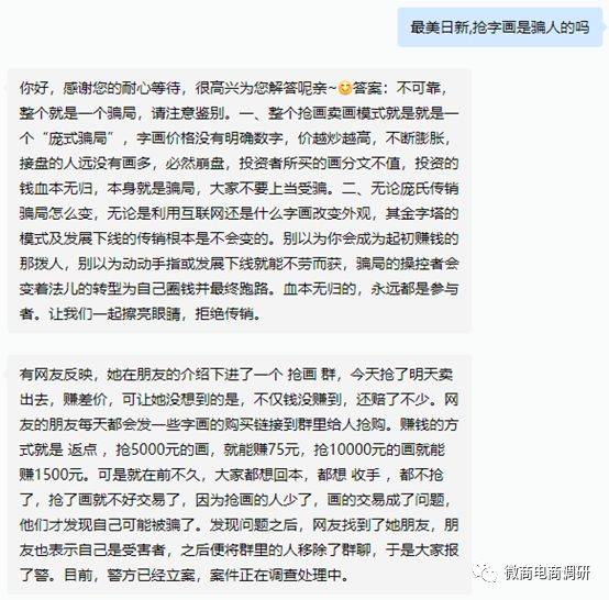 最近几年,关于抢画卖画骗局的报道已屡见报端,从“紫气东来心诺画苑”到“典画网”,无一不是最后以崩盘告终,周口市公安局川汇区分局也已给“典画网”定性为传销。2021年,《民生导报》还曾在一篇题为《手机上抢画卖画每天稳赚百余元?已有多人“被套牢”》的报道中描述了受害人在一个名为“画苑”平台(北京吾仁网络文化有限公司)上当受骗的经历,该平台推行的模式与最美日薪极其相似。