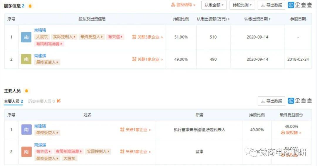 企查查APP显示,南强强共与5家企业有关联。他除了是延安富恒星企业管理咨询服务有限公司的大股东外,还对外投资了喀什辉煌商贸有限公司,控股90%并担任监事;投资了喀什金瑞祥房产经纪有限公司,持股40%并担任法定代表人、执行董事兼总经理;经营了阿拉尔市水宜生水杯专卖店和喀什市水宜生系列产品销售店。其中喀什市水宜生系列产品销售店已注销,阿拉尔市水宜生水杯专卖店被吊销了营业执照,喀什金瑞祥房产经纪有限公司也被吊销了营业执照并且有严重违法记录。