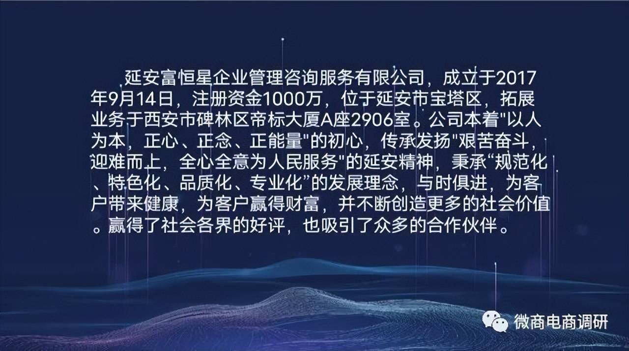 近日,微商电商调研发现,“富恒星”喊着“大健康创业平台”、“消费增值”、“以利他为根本,以助他为己任”、“正心正念正能量,共生共荣共进退”等口号在各社交平台大肆宣传,宣称其平台可以在消费的同时创造财富。