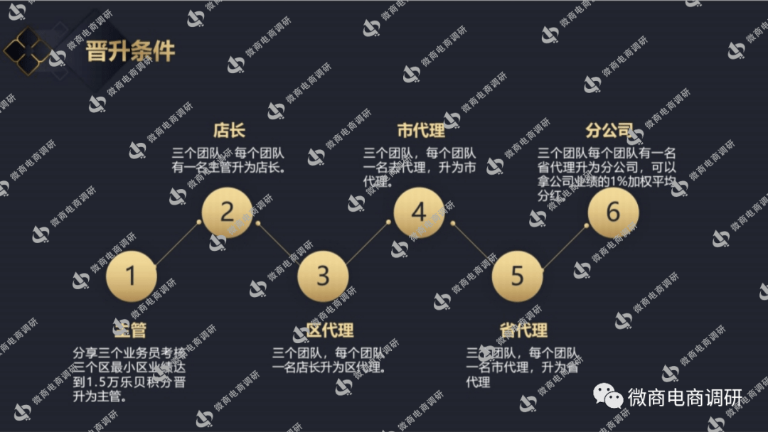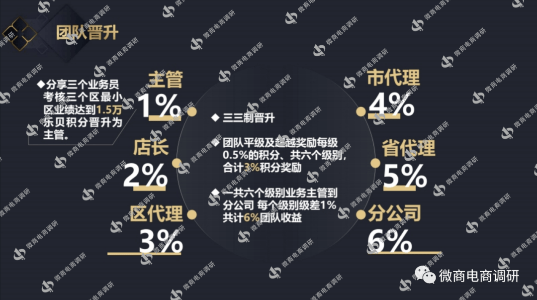 分享三个用户,且业绩最差的用户业绩达到1.5万乐贝积分可晋升为主管,主管可获得整个团队积分流水1%的团队奖励;团队下拥有三个团队,每个团队各拥有一名主管可晋升为店长,店长可获得整个团队积分流水2%的团队奖励;三个团队中,每个团队拥有一名店长可晋升为区代理,区代理可以获得整个团队积分流水3%的团队奖励;三个团队中,每个团队拥有一名区代理可晋升为市代理,市代理可以获得整个团队积分流水4%的团队奖励;三个团队中,每个团队拥有一名市代理可晋升为省代理,省代理可以获得整个团队积分流水5%的团队奖励;三个团队中,每个团队拥有一名省代理可晋升为分公司,分公司可以获得整个团队积分流水6%的团队奖励,还可以额外获得整个公司业绩1%的加权平均分红。