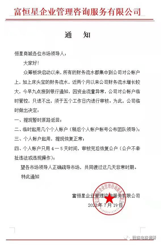 另外,微商电商调研注意到,在富恒星会员群里有一则公告,在会员间相互传阅,主要内容为告知恒星商城的市场领导人,称众筹板块启动以来,财务流水激增,因资金流量异常,公司对公账户临时管控,资金只进不出。等增加几个个人账户以后,市场会员才能提现。这意味着最近几天会员的钱只能打到富恒星公司的账上,获得的收益却没有办法提现。这种不符合正常规范的操作,也提醒着广大参与者,该平台的稳定性实在堪忧,一定要谨慎投资。