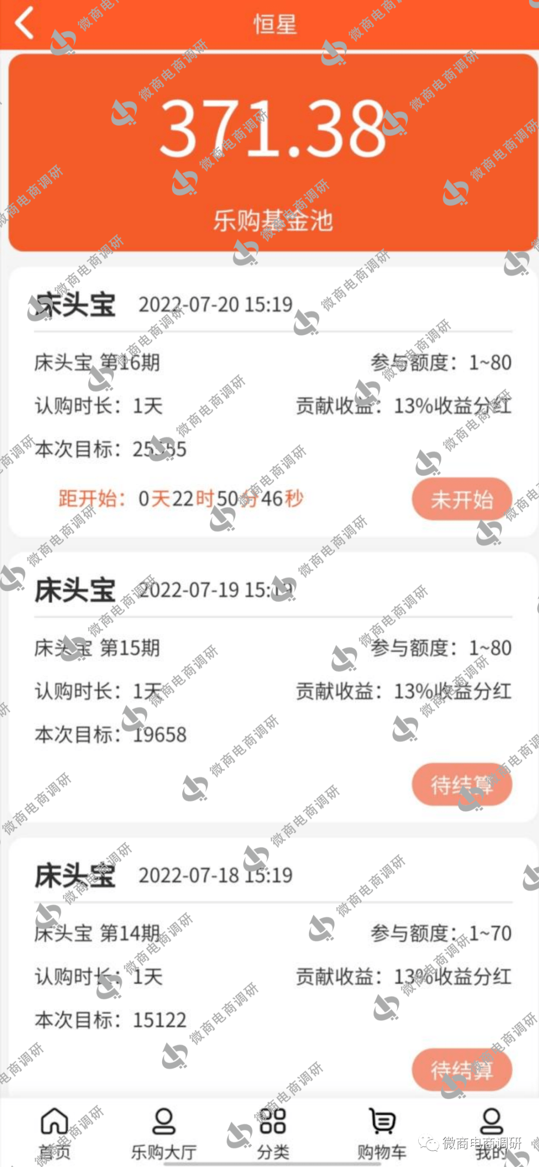 乐购大厅分为鸿图远业、富恒星、床头宝和蕲艾四个区域,每个区域都有各自的开始时间、额度以及基金池。