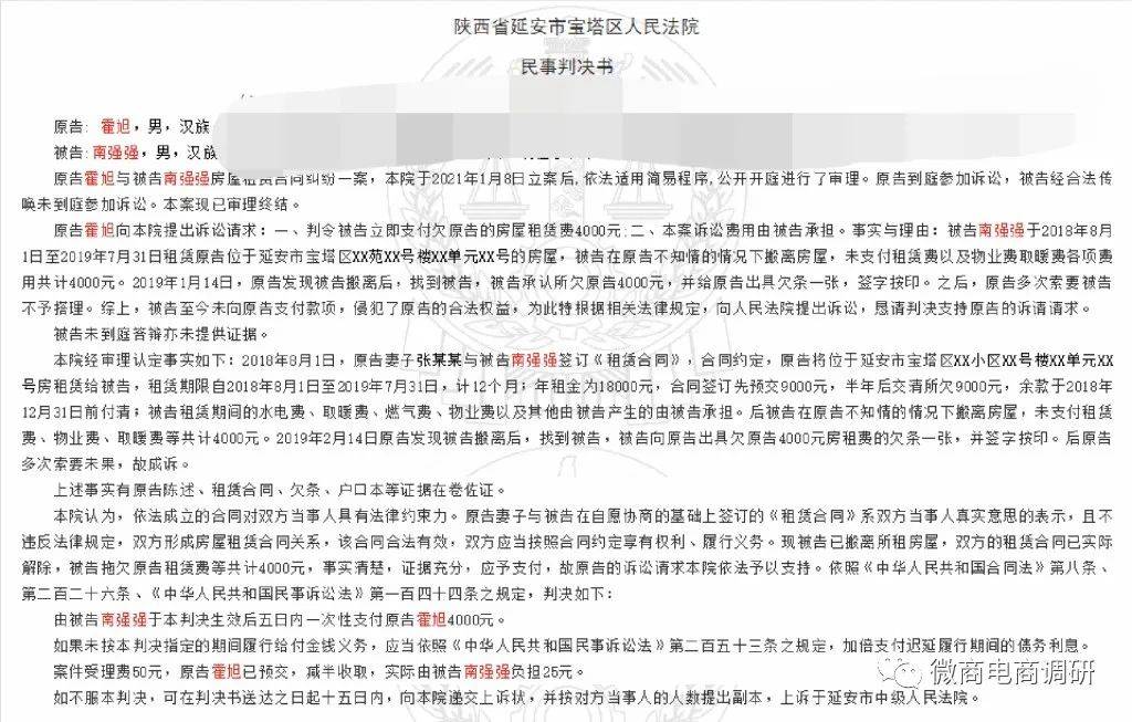2021年1月8日,霍某将南强强告上法庭。原因是南强强租赁了霍某的房屋,却在霍某不知情的情况下搬离房屋,未支付租赁费以及物业费、取暖费各项费用共计4000元。2019年1月14日,霍某发现南强强搬离后,找到南强强,南强强承认所欠霍某4000元,并给霍某出具欠条一张,签字按印。之后,霍某多次索要南强强不予搭理,故成诉。法院判决南强强一次性支付霍某4000元。