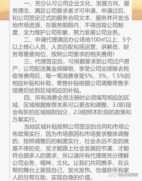 成为代理后当然是会有额外收益产生的,据《各地公司分佣/分配方案》显示,省级公司能拿新增业绩2%,市级公司能拿新增业绩3%,区县级公司能拿新增业绩5%。当然,随着模式的变化,上述这些数字可能也随之产生了变动。在申请代理页面内,出现的数字就不是5%、3%、2%,而是5%、3%、1.5%。