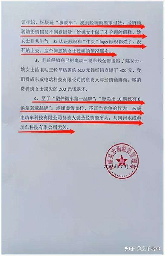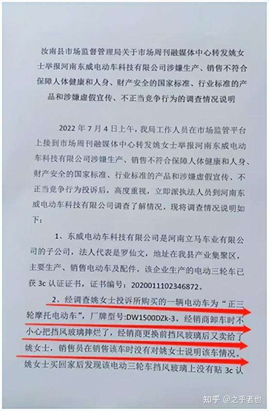 7月5日,河南东威电动车科技有限公司所在地汝南县市场监督管理局给记者的《关于河南东威电动车科技有限公司涉嫌生产、销售不符合保障人体健康和人身、财产安全的国家标准、行业标准的产品和涉嫌虚假宣传、不正当竞争行为的调查情况说明》中称:“经调查姚女士投诉所购买的一辆电动车为“正三轮摩托电动车”,厂牌型号:DW1500DZK-3,经销商卸车时不小心把挡风玻璃摔烂了,经销商更换前挡风玻璃后又卖给了姚女士,销售员在销售该车时没有对姚女士说明该车情况。姚女士回家后发现该电动车挡风玻璃上没有贴3C认证标识,怀疑是“事故车”,找到经销商要求退货,经销商聘请的销售员不同意退货,给姚女士做了不合理的解释,姚女士非常生气。3C认证标识和“牛头”logo标识都烂了,没有贴上去,这个问题姚女士反映的情况属实”。至于“塑件微车第一品牌”,“每卖出10辆就有6辆是东威品牌”,涉嫌虚假宣传、不正当竞争的行为,东威电动车科技有限公司负责人说是经销商所为,与河南东威电动车科技有限公司无关。