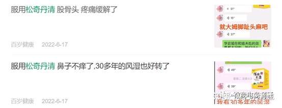 为了证明松奇丹清具有保健作用,甚至是治病奇效,各种案例开始在网上层出不穷。有人服用了该产品,股骨头疼痛缓解了,还有人30多年的风湿好转了。