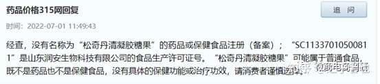 不久前,药品价格315网在接受网友咨询时也曾明确答复:“松奇丹清凝胶糖果”属于普通食品,既不是药品也不是保健食品,没有具体的保健功能或治疗功效,请消费者谨慎选择。
