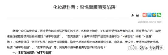 早在2020年1月2日,国家药监局就发布了题为《化妆品科普:警惕面膜消费陷阱》的文章,文章明确表示不存在所谓的“械字号面膜”,不能用“医用面膜”作为名称。